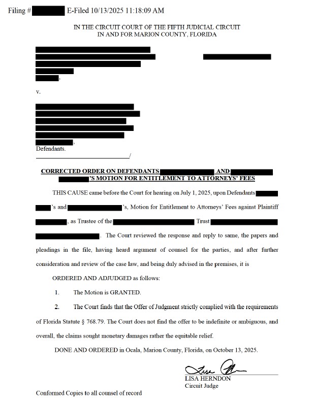 The Plaintiff’s rejected the proposal. That decision had consequences. When the Court later granted final summary judgment in favor of the Defendants, adopting the same legal theories the Defense had preserved from the outset, the Proposal for Settlement became operative. Because the Defendants had offered to pay the Plaintiff money and ultimately the Plaintiff recovered nothing, the statutory entitlement to fees was automatic. The Defense timely moved for entitlement within the thirty-day deadline imposed by Rule 1.525, and the Court found that the proposal complied with all procedural requirements, was made in good faith, and applied to the monetary claims asserted. With those findings, the Court confirmed that the Defendants were entitled to reasonable attorneys’ fees from the date the Proposal for Settlement was served, with a specific amount to be determined at a later hearing.